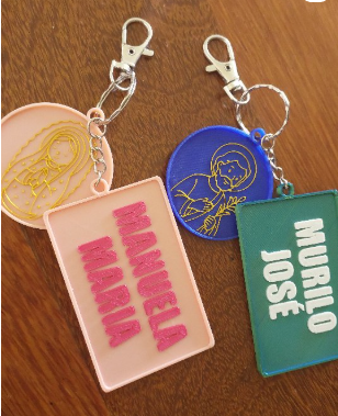 Exemplo.: Chaveiro redondo com a imagem de nossa senhora na cor AZUL e